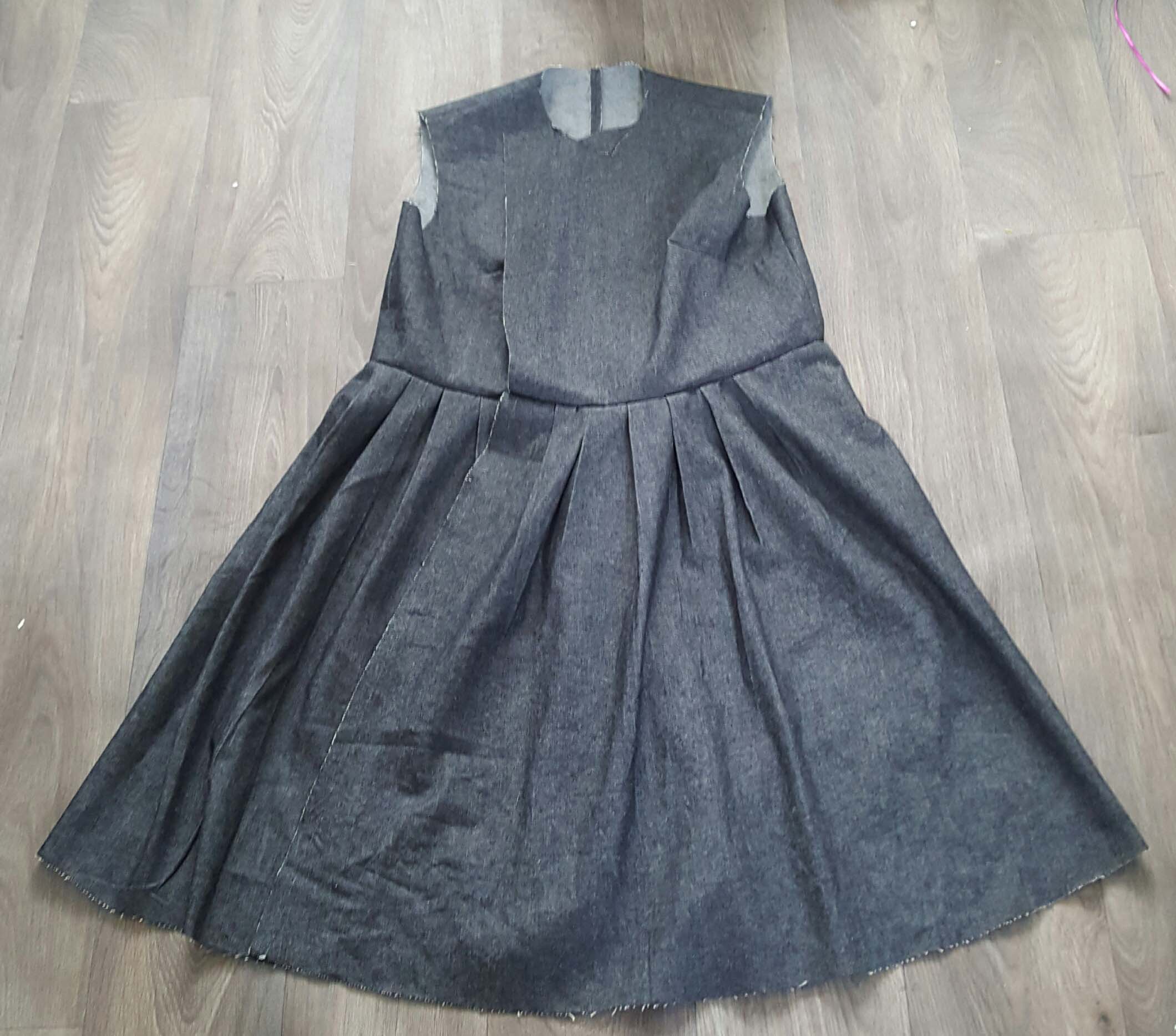 With Right Sides Together, sew the Bodice and Skirt together matching the Side Seams and Middle Back Seam. Finish the Seams and Press. So when its turned out the Right Side it should look like this. Now this is the time to get rid of the tacking stitches that we made earlier 🙂