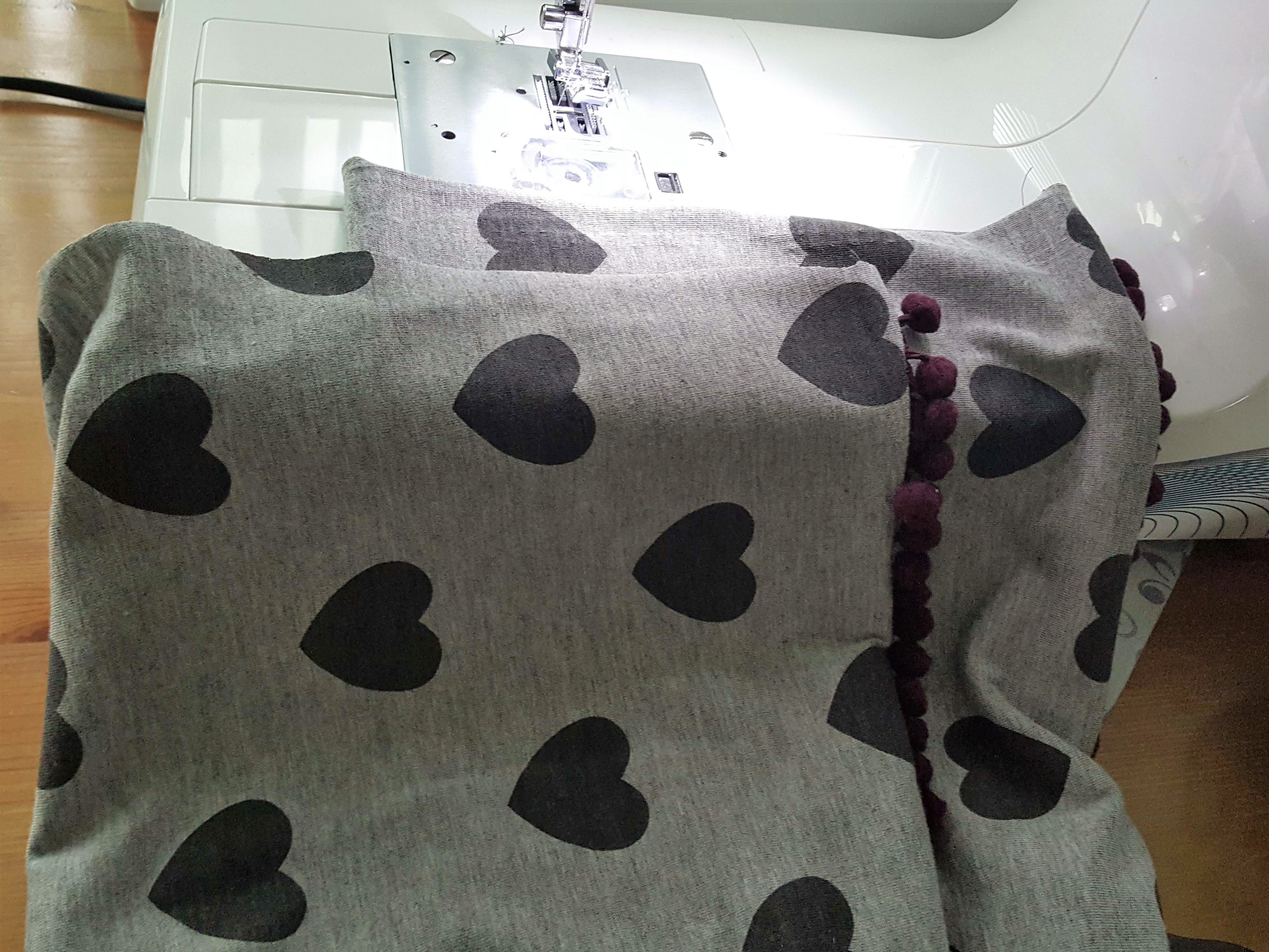 Now remember to use your Zipper foot as this will get as close as you can to stitch in the trim as if you try to sew with the normal foot it wouldn’t get anywhere near to secure the pom poms. I also set my Machine to a small Zig Zag Stitch.