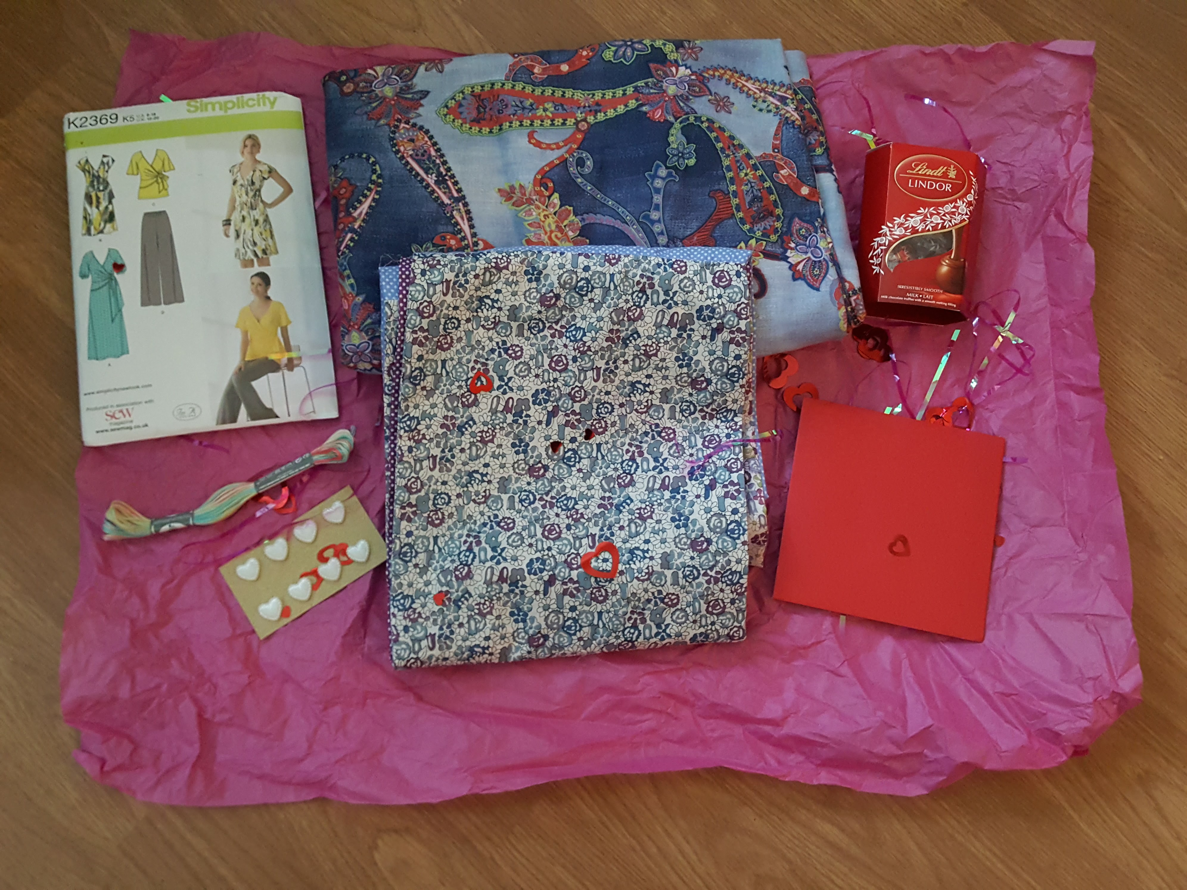 I made her a Patchwork Scarf in the Colours that she likes, Lindt Choc, who can’t say no to them?!, Heart shaped embellishments, some yummy threads, 2.5m of Jersey and a Pattern to use it for if she liked!