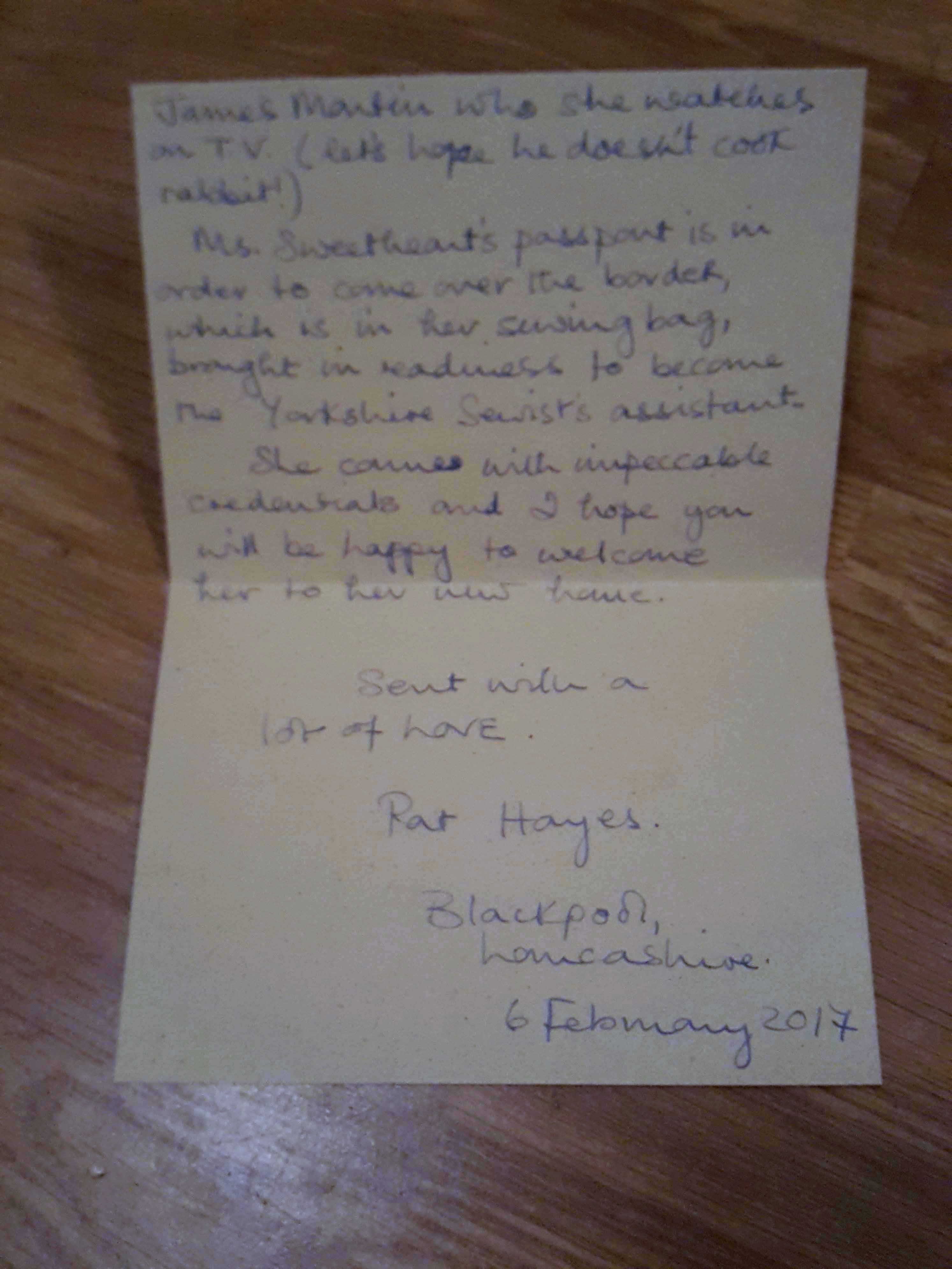 I just love my Ms Scarlet “Red” Sweetheart she is utterly adorable!! Love how she has come equipped with her Lancashire passport and Sewing Equipment, ready to give me a hand!! Pat wrote a lovely little note of how Ms Scarlet came about and hoping one day to meet the ‘Yorkshire Chef’ James Martin! I hope so tooo!! Hahahaha!