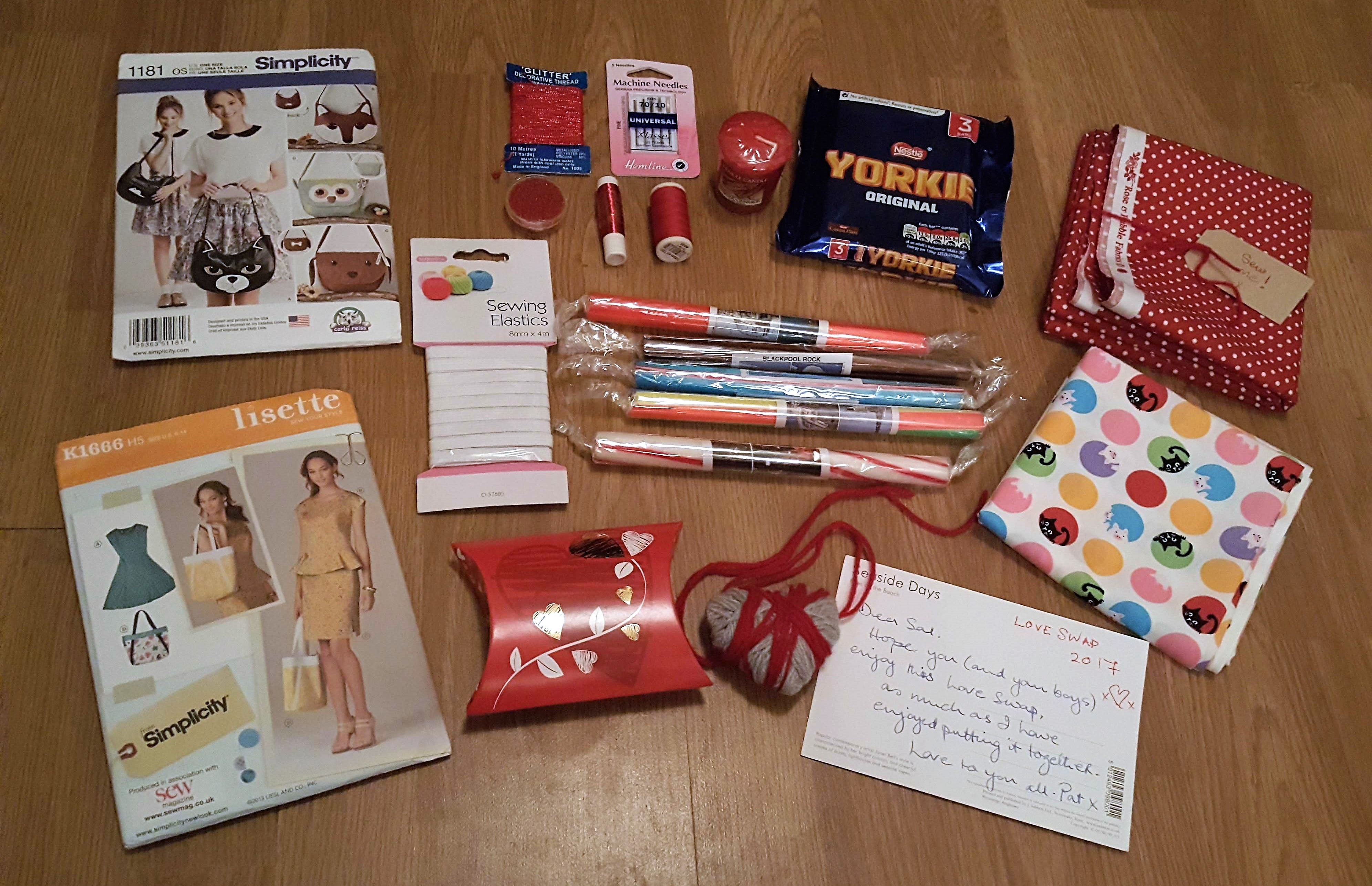 Now here are the contents unwrapped!! Fab Polka Dot Cotton Fabric by Rose & Humble and Cat and Piggies Print Cotton Fabric!! Simplicity 1181 Cat/Dog/Fox/Owl Bag Making Pattern!! Ill def be making a Foxy Bag!! Lisette K1666 H5 Dress, Top, Skirt and Bag Pattern, Sewing machine needles, Threads, Beads, Yankee Candle in Sweet Cinamon oh yes!! Lovely Wool Heart, Elastic and not forgetting the Chocolates and Rock!