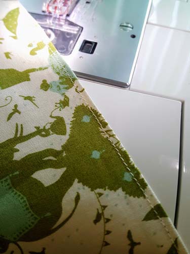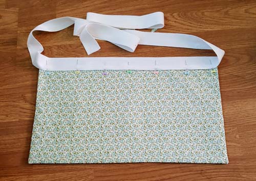 Start at one end of the Apron, sew the Tape to the Fabric along the length of the Cotton Tape, Finish where the Apron finishes. The line of Stitching needs to be as close to the edge of the Tape as possible, like this;