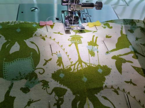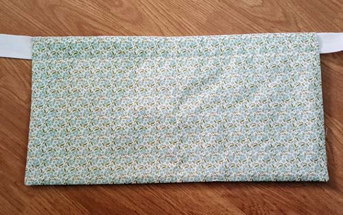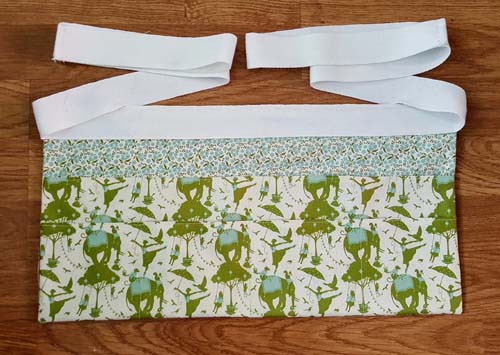 Start at one end of the Apron, sew the TapeΒ to the Fabric along the length of the Cotton Tape, Finish where the Apron finishes. The line of Stitching needs to be as close to the edge of the Tape as possible, like this;