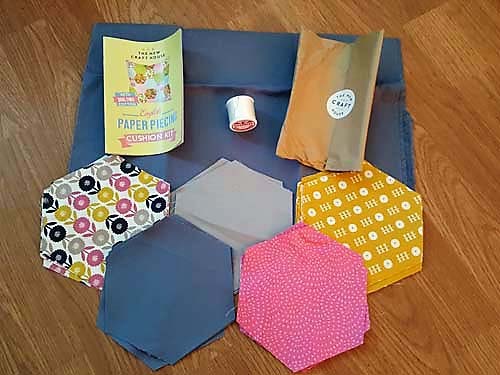 Now when i was browsing through the Sew Crafty Shop for my Design Team Projects, I came across this kit from New Craft House to make your own Cushion Cover using the English Paper Piecing technique. EPP is the technique of folding fabric over paper templates and hand sewing these together.Β The paper template shape ensures the blocks are accurate and also makes it easier to piece angles together.
