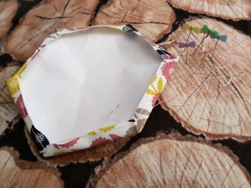 All you have to do is to take one pre-cut Hexie and one Paper Hexie, fold the fabric over it and baste the fabric so that the Paper Hexie is encased to give it that lovely sharp edges π