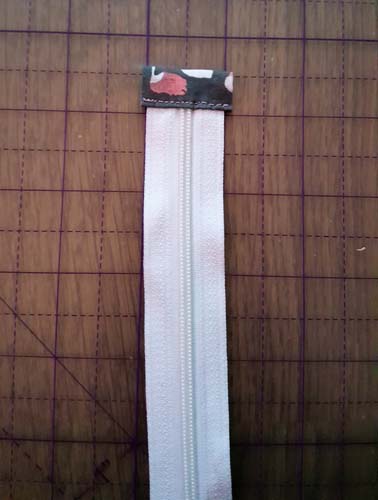 Fold the Tab up and over the end of the Zip and that the folded edge underneath matches the top and stitch in place as near as you can to the edge and to make sure you catch both the top and underneath of the Tab to secure in place. Trim the Tab to slightly wider than the Zip itself. There you go, one Zip Tab made! Now to repeat for the other end of the Zip!