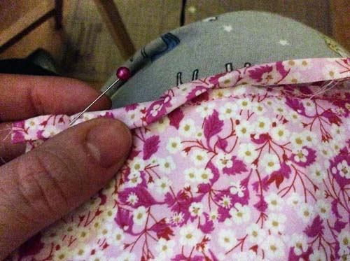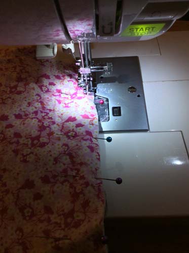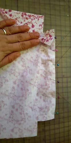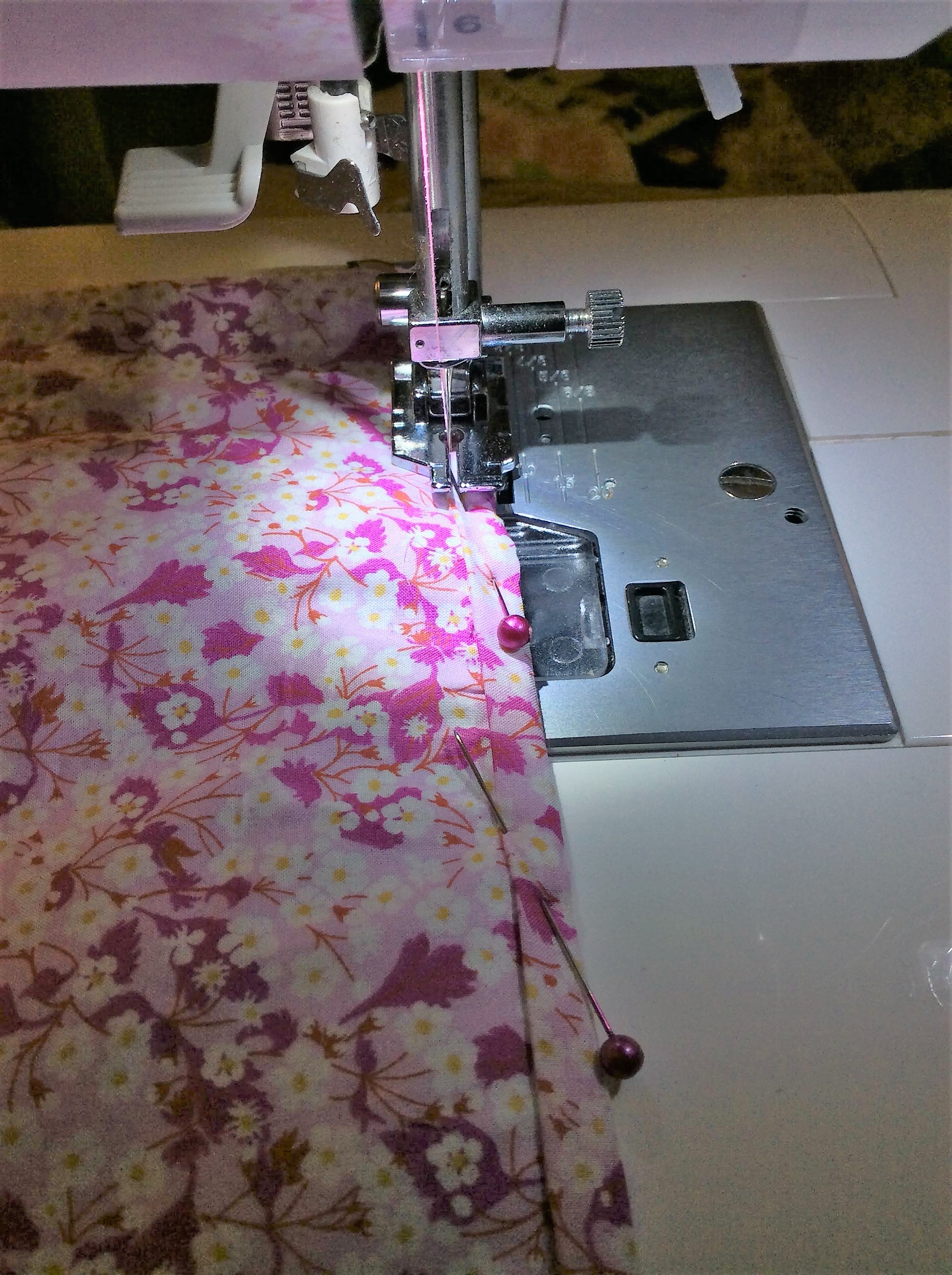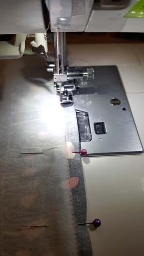 Pin the Binding in place matching the raw edge of the Side Seam with the long Edge of the Binding and stitch using 1/4″ (0.6) or follow that the crease. Trim the Seam Allowance a little as this will help for the Binding to fold over easier and then pin in place and Sew as near as you can to the edge to secure. Repeat for the other Side Seam.