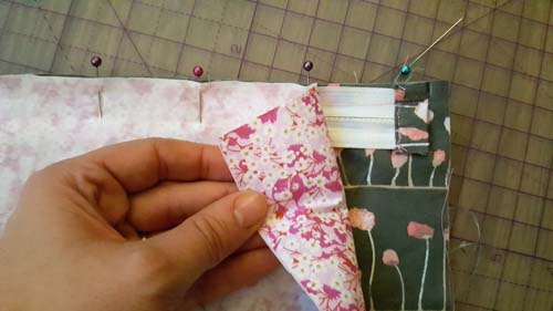 Next up, attaching the Zip to the Pouch! Place the Zip Right Side down on the Top edge of the Outer Piece and make sure that the Zip ends match up with the marks on the Pouch that we made earlier. Then pin in place and stitch along using 1/4″ (0.6cm) Seam Allowance.