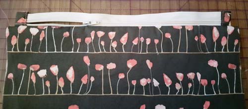 The zip is not actually sewn into the side seam – the tab encases the ends of the zip. Then the sides are sewn with the lining in place – there’s no bulky stuffing used for lining inside the pouch just interfacing. Bias binding is used to cover the raw edges inside the Bag for a neat finish. Supplies: