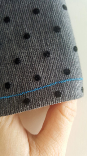 I used Grey Velvet Polka Dots Milano (love it!!) for the Sleeves, Blue ( i would say teal!) Milano and for the collar, i used some Black ribbing in my stash.